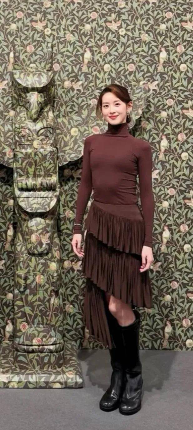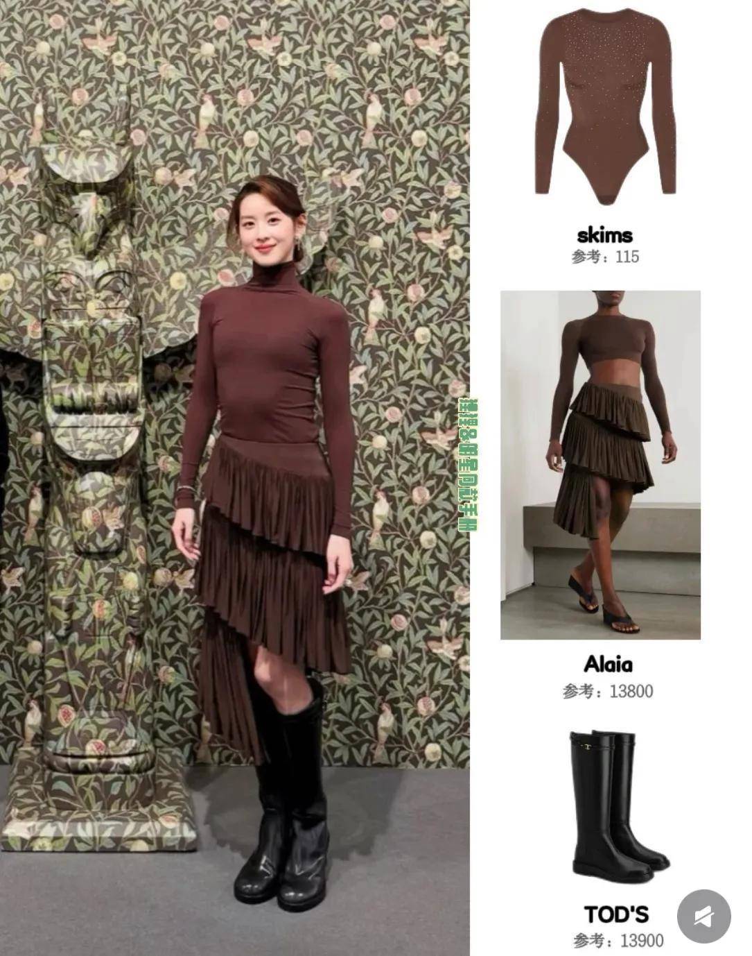 章泽天参加艺术展晚宴的穿搭颇为吸睛,百元巧克力色高领打底衫,搭配万元流苏裙,脚蹬TOD'S高筒靴,法式风格尽显气质,看上去颇具艺术气息。