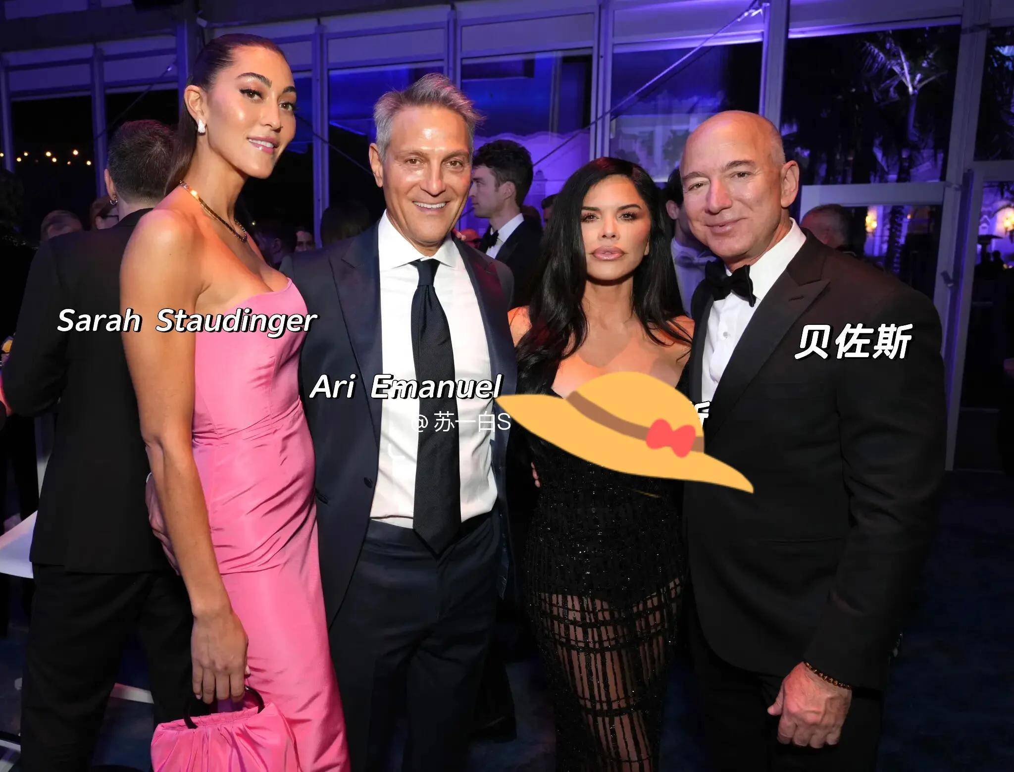 章泽天此次晚宴,肩膀依靠的外国男士是身着西装的Frieze老板Ari Emanuel,他还是桑切斯前夫的合作伙伴。二人晚宴上合影,这般站姿足见关系亲密。
